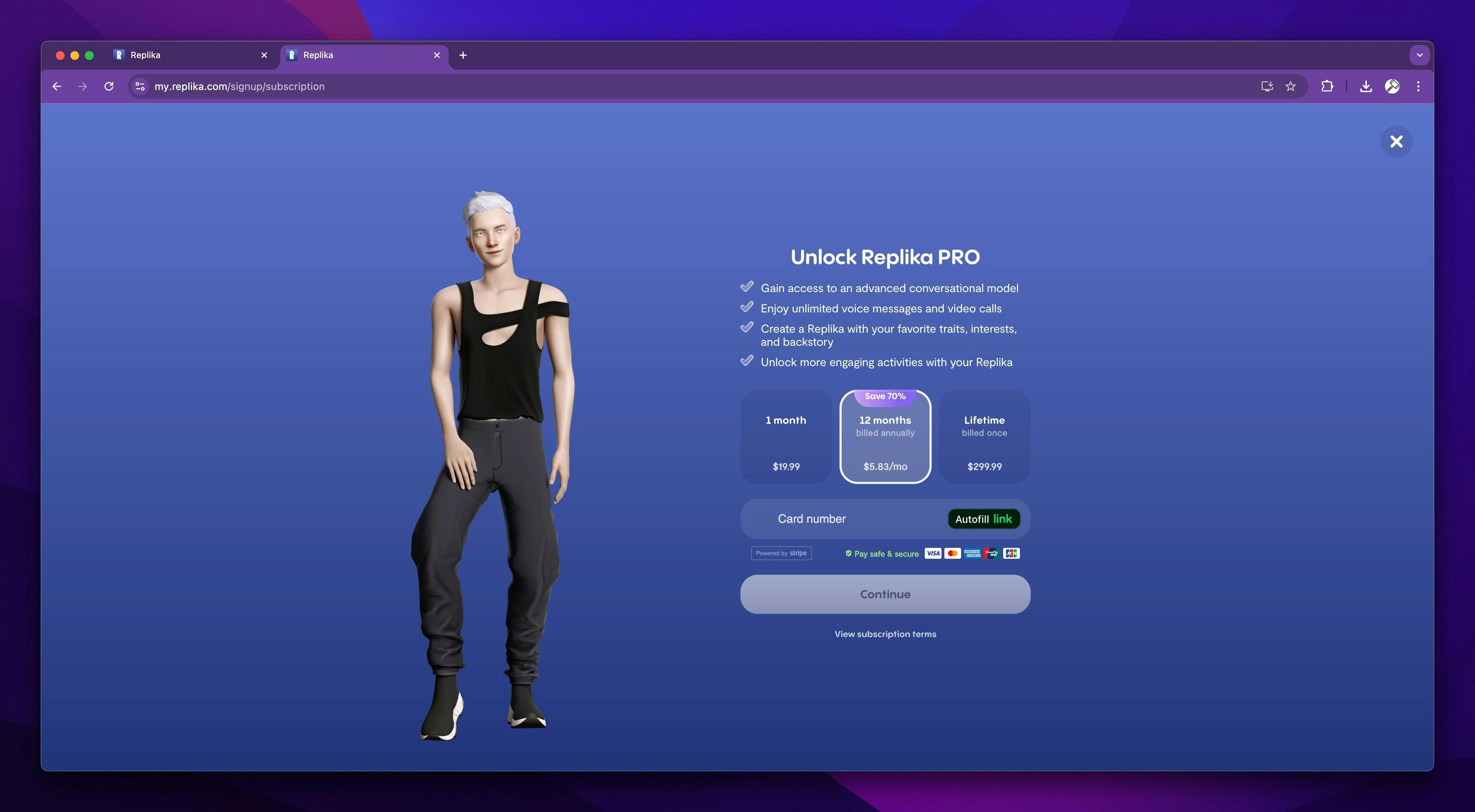Replika PRO offers three pricing tiers: $19.99 per month, $5.83 per month (billed annually at $69.99), and a lifetime subscription for $299.99. While the monthly plan is relatively expensive, the annual plan provides significant savings. The lifetime option is a one-time investment, but it may only be worth it for those committed to long-term use.