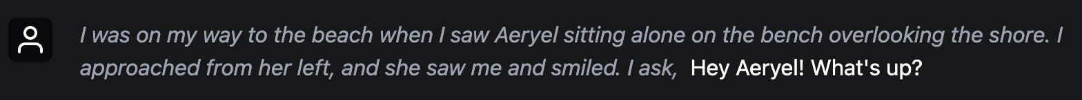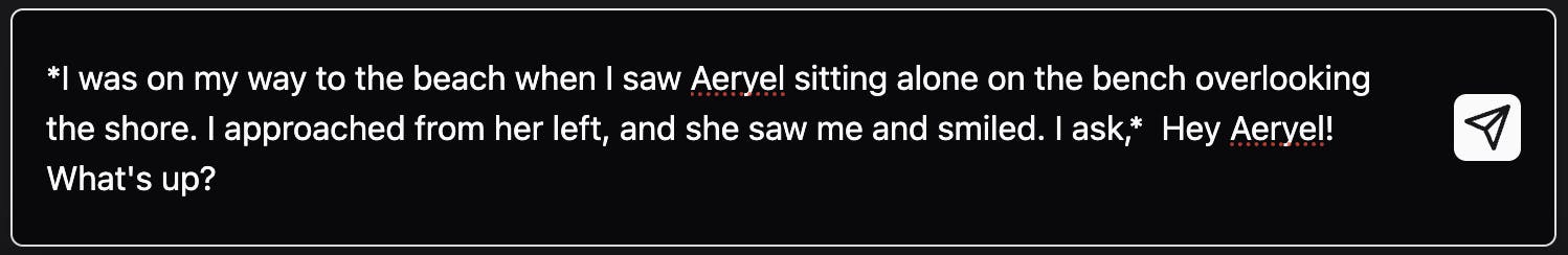 - Plain white text – Generally used for spoken dialogue, written normally in the input bar.